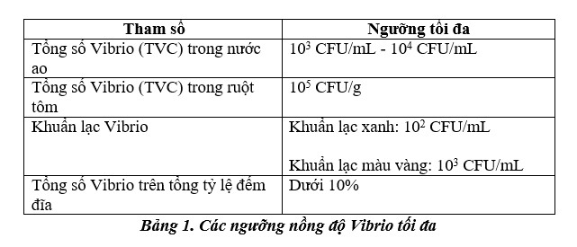 Vì Vibrio sống phổ biến trong nước ao, việc theo dõi nồng độ Vibrio và duy trì chúng dưới một ngưỡng nhất định có thể là một trong những cách để ngăn ngừa nhiễm Vibrio. Ngưỡng tối đa giữa các trại là khác nhau, tùy thuộc vào lịch sử trang trại, điều kiện và hoàn cảnh môi trường. Dưới đây là một số ngưỡng tối đa phổ biến nhất: