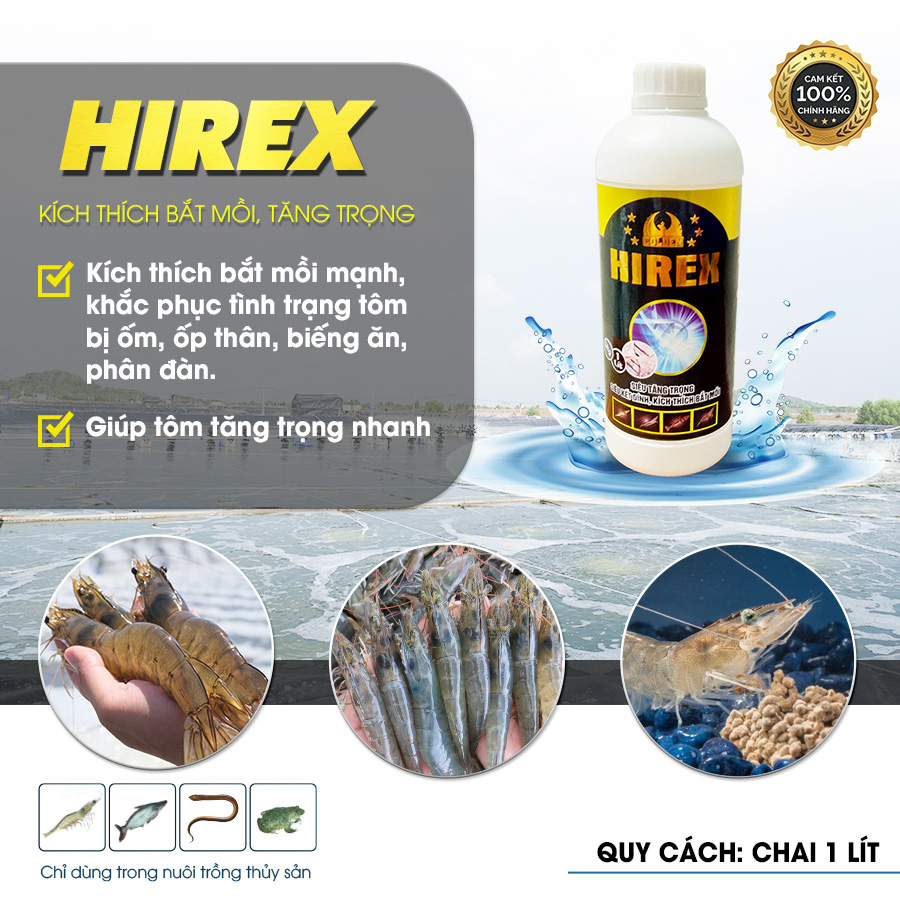 HIREX gồm các protein và acid amin hàm lượng cao với công dụng vượt trội kích thích tôm bắt mồi, giúp tôm tăng trọng an toàn, giảm hệ số FCR, tăng chất lượng thịt, đạt đầu tấn.