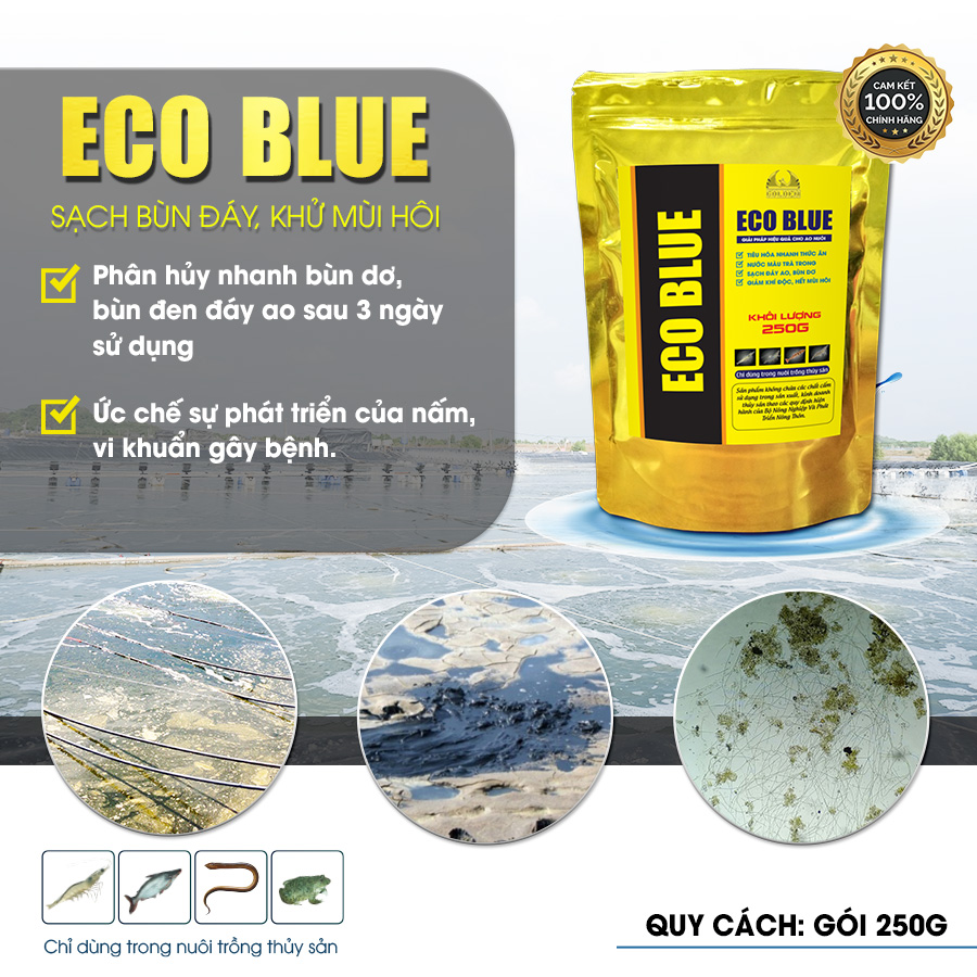 - Để đạt hiệu quả cao hơn, có thể trộn ECO BLUE với cơm nguội, sau đó vùi vào lớp bùn dưới đáy ao, định kỳ 10 ngày/lần để ngăn mùi hôi và xử lý bùn dơ.