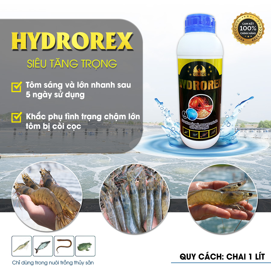 Do vậy khẩu phần ăn có bổ sung các chất dinh dưỡng cân bằng là cần thiết để khắc phục sự thiếu hụt dinh dưỡng trong nuôi tôm/cá. Quỳ bà con có thể tham khảo sản phẩm HYDROREX với thành phần gồm nhiều vitamin (A, D..) và acid amin thiết yếu (lysine, methionine…) nhằm tăng cường dinh dưỡng và giúp tôm lớn nhanh, chắc thịt, nặng ký, màu sắc bóng đẹp.